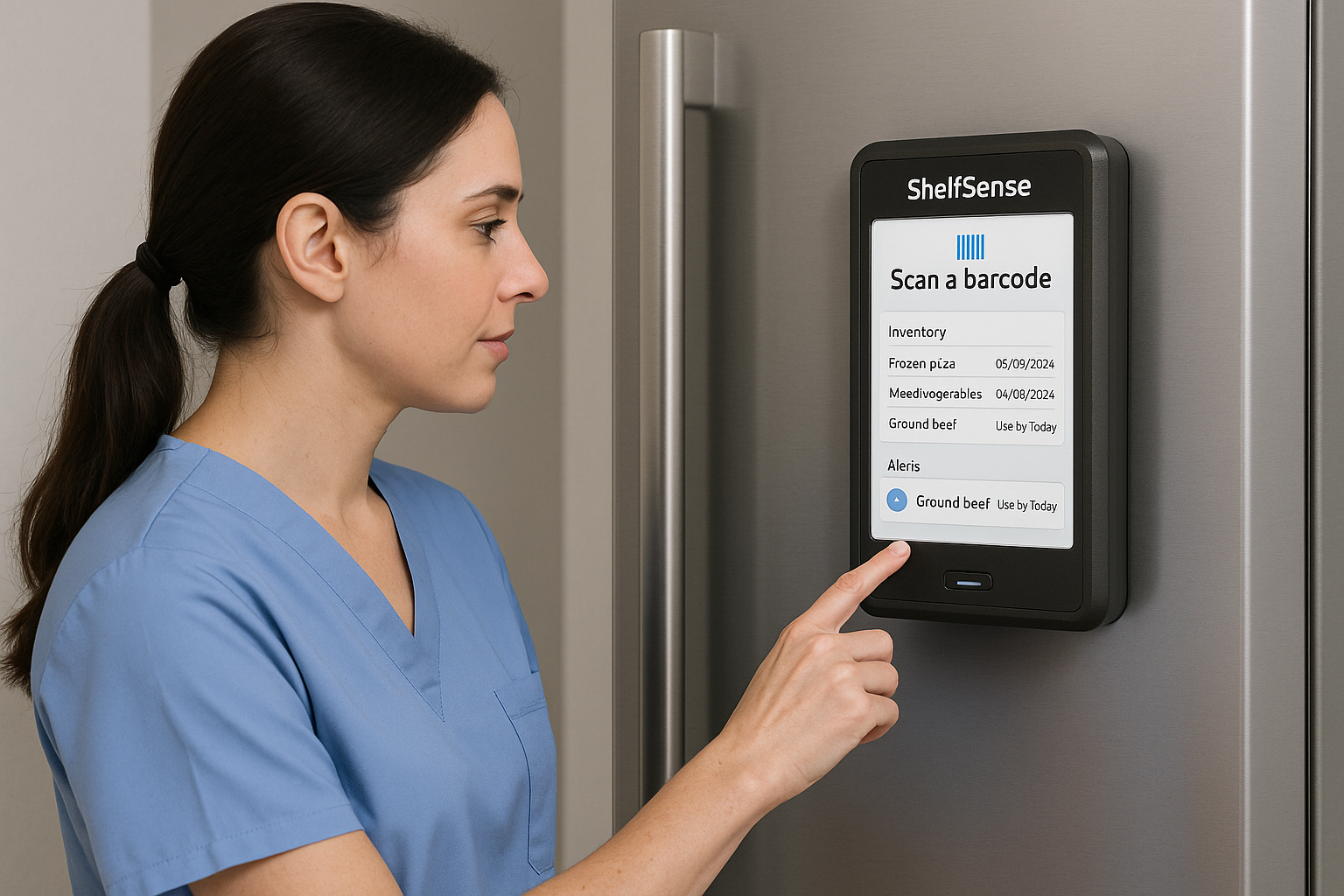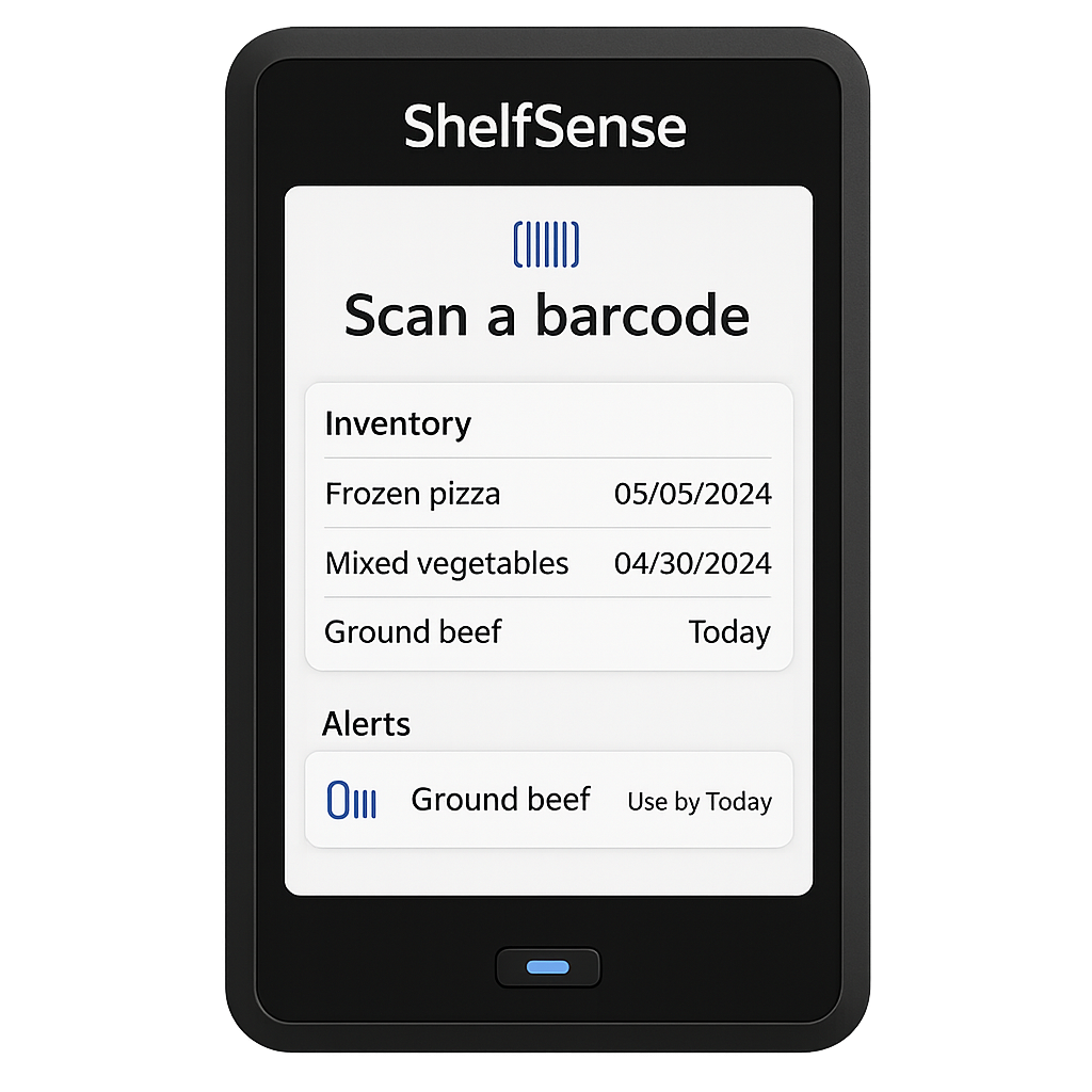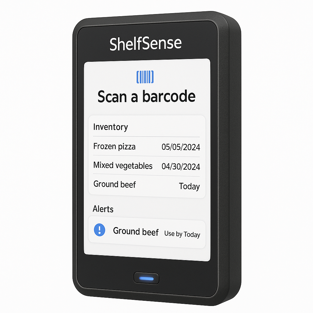 ShelfSense is a screen device that attaches to your fridge or freezer, scans barcodes, and stores expiry dates and exact locations of food.