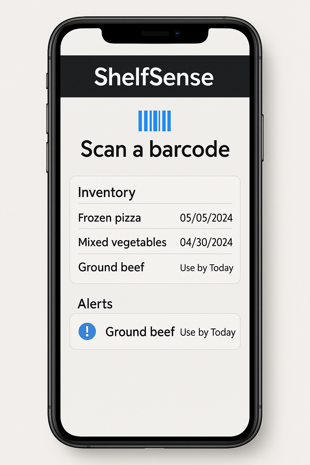 ShelfSense is a smart freezer companion that scans barcodes, tracks expiry dates and locations, and reminds you before food goes to waste — designed with older adults, caregivers, and households in mind.